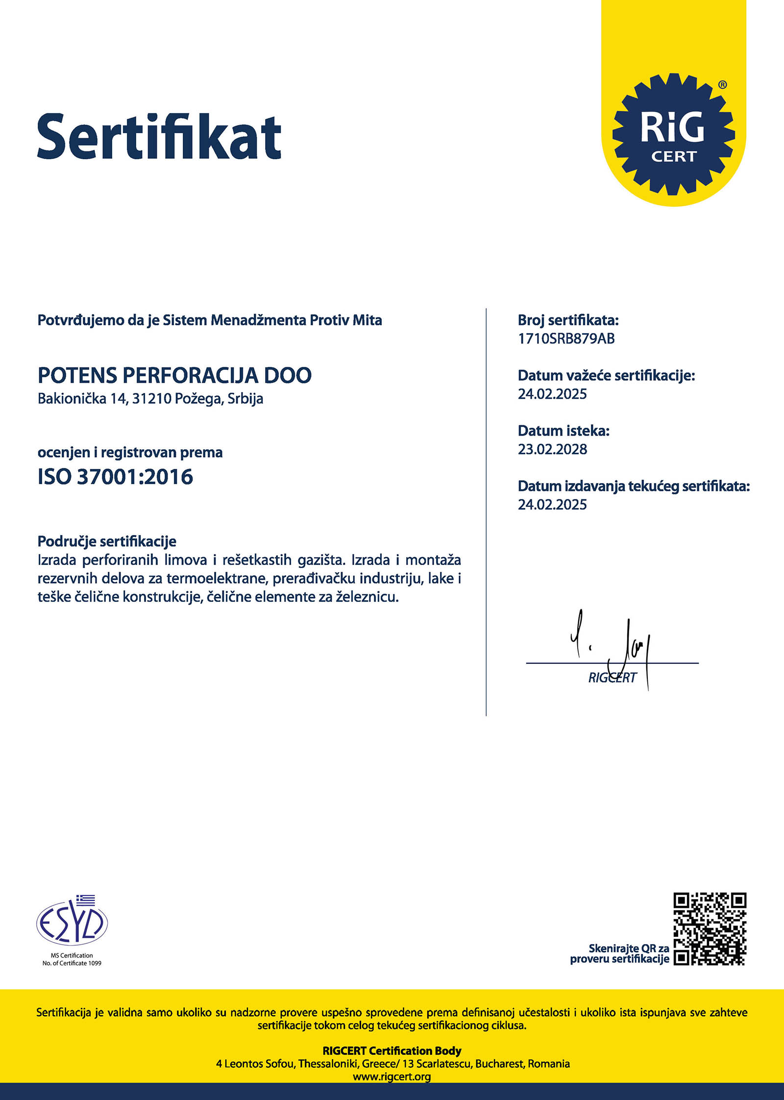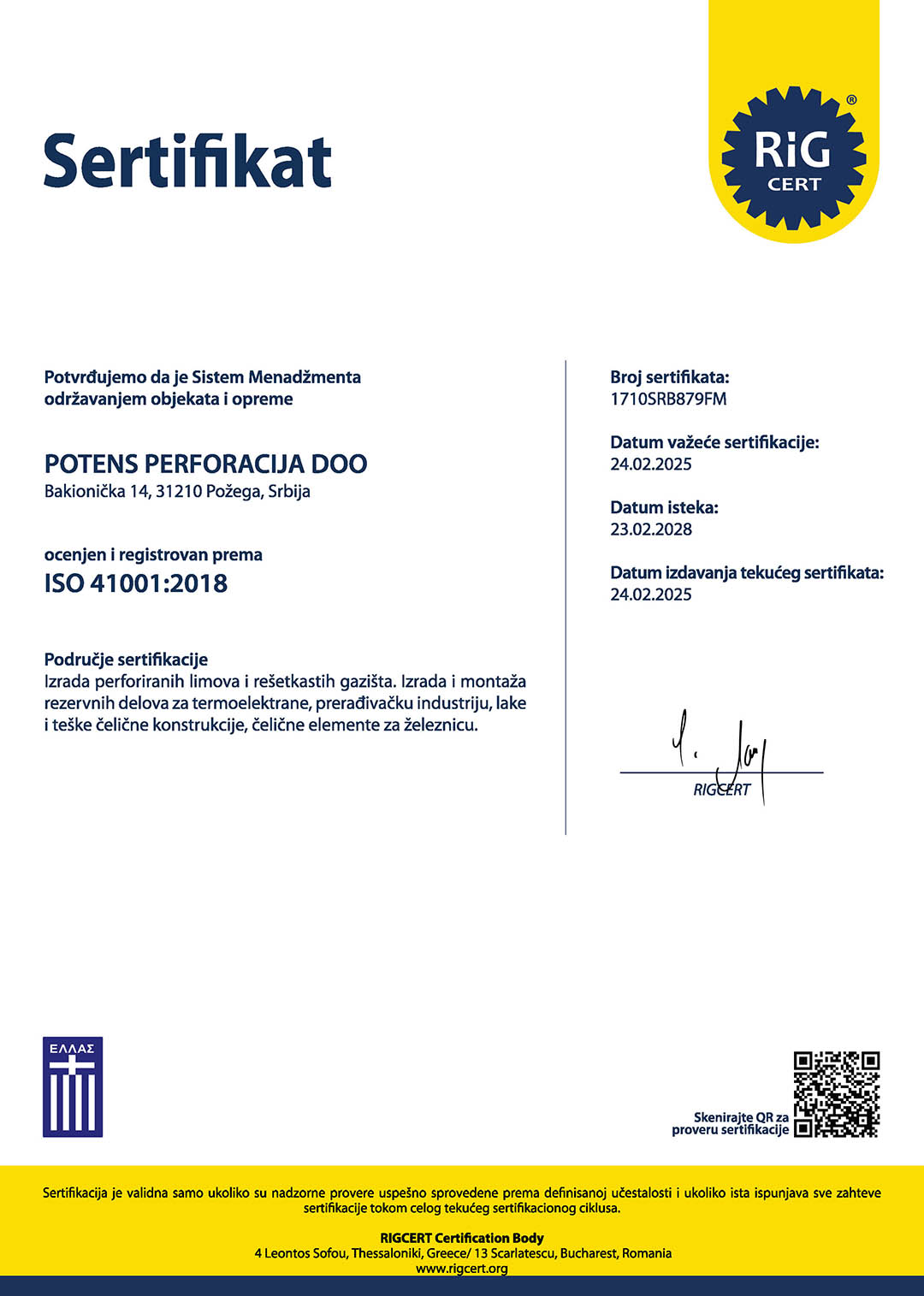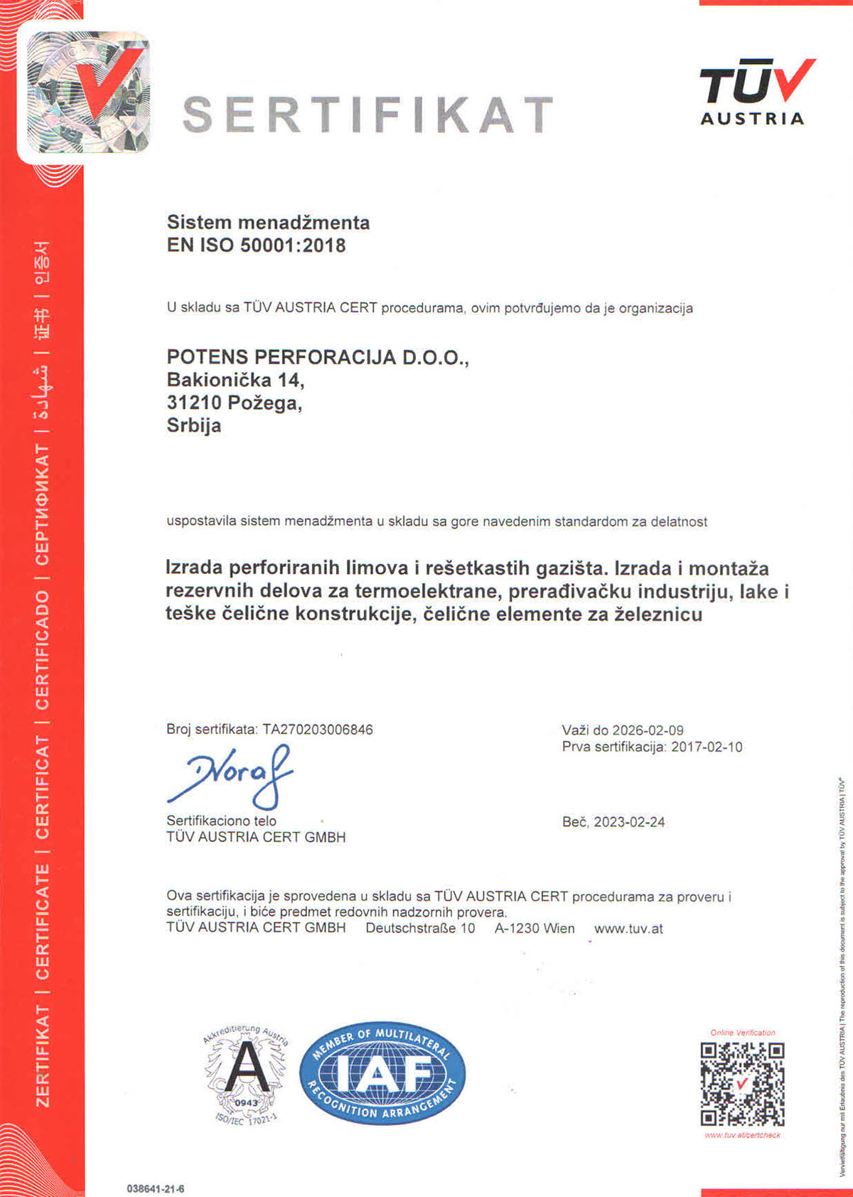 Ovi dokumenti potvrđuju našu posvećenost izvrsnosti u proizvodnji, bezbednosti, odgovornosti prema životnoj sredini i poslovnom kontinuitetu obezbeđujući sigurnost i miran san i za nas i za naše klijente.